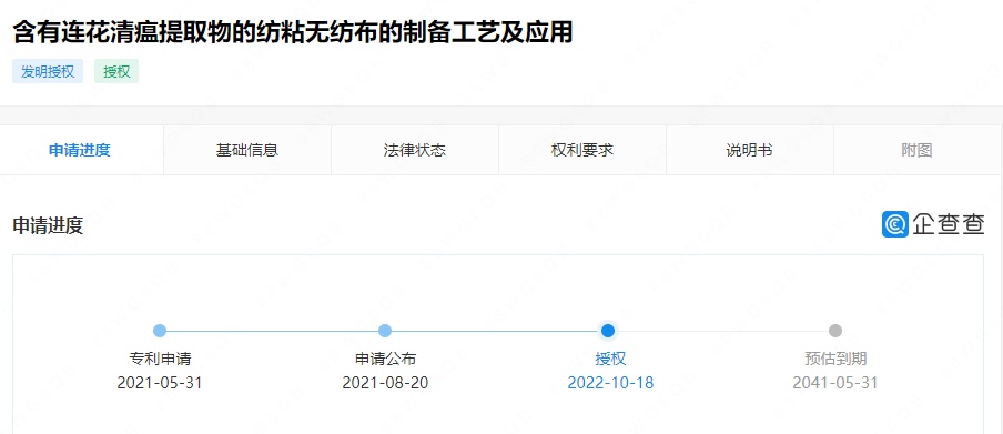 据说明书介绍,该发明通过聚合物原料的配比与加工,使得最终纺粘无纺布中含有了连花清瘟提取物成分,制备出的纺粘无纺布再应用到皮肤接触的衣物、或家用纺织品、或医用防护品时可以具有抗炎、抗菌、抗病毒的功能,在新型冠状病毒方面具有较好的抑制效果。