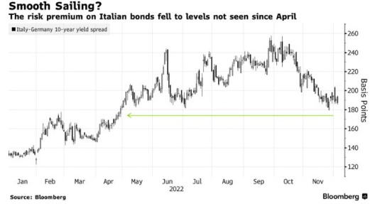 而意大利目前的状况展现出极大的风险性,主要由于新任命的总理乔治亚·梅洛尼(Giorgia Meloni)正在努力遏制其民粹主义联盟的财政量化宽松要求。穆迪投资者服务公司警告称,该国公共财政目标可能无法实现。