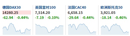 2. 截至发稿,德国DAX指数跌0.44%,英国富时100指数跌0.10%,法国CAC40指数跌0.44%,欧洲斯托克50指数跌0.46%。