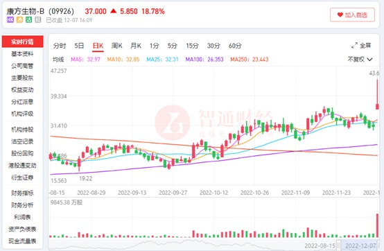 值得一提的是,该笔交易额已刷新了百济神州TIGIT授权给诺华的29亿美金的记录,受此消息的影响,康方生物股价大幅高开,盘中一度涨超30%,截至12月7日收盘,公司股价涨18.78%。