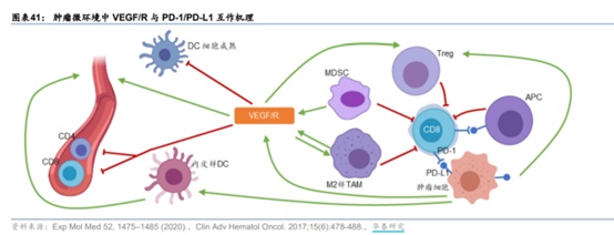 1)肿瘤微环境中,VEGF过表达促进Treg细胞招募,Treg细胞进而导致CD8+T细胞耗竭、以及M1样TAM细胞极化为M2样TAM,从而在肿瘤微环境中限制免疫活性。因此抗VEGF药物通过降低微环境中的VEGF水平,对肿瘤免疫疗法疗效产生促进作用。