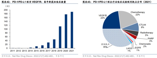 凭借着VEGF与免疫疗法间的协同作用,近年VEGF与PD-1/PD-L1联合用药的临床试验数目快速增长。依据Nature Reviews Drug Discovery综述,2021年PD-1/PD-L1所有联合疗法临床试验的近四分之一为联用抗VEGF/R药物。