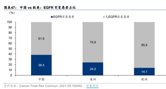 从产品来看,依沃西进展最快的适应症为非小细胞肺癌。据弗若斯特沙利文,2021年中国肺癌新患者约81万人,其中85%为非小细胞肺癌。EGFR突变是肺癌中最为常见的驱动基因突变类型,且中国患者群体中的突变频率较欧美更高:中国约38.4%晚期非小细胞肺癌患者存在EGFR突变,远高于美洲人群的24.2%与欧洲的14.1%。EGFR突变通常导致病人的预后更差,但携带此驱动基因突变的病人也对EGFR-TKI治疗更为敏感。