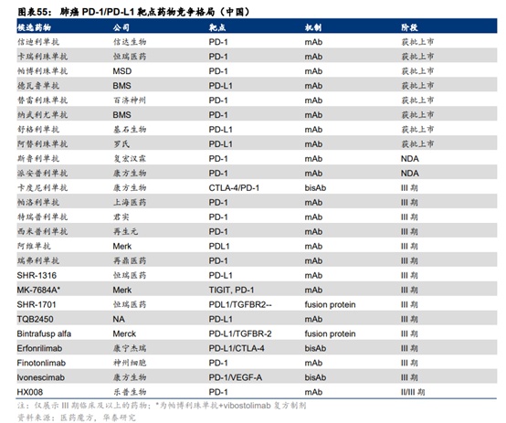 不过由于PD-1/PD-L1抗体在非小细胞肺癌中的优秀疗效与庞大的患者群体,众多药企纷纷将PD-1/PD-L1抗体布局肺癌领域,进而导致该领域竞争激烈。目前国内已有8款PD-1/PDL1抗体获批治疗一线非小细胞肺癌,此外还有20款候选药物处于关键性临床。