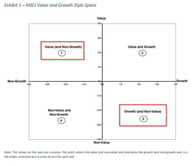 等等,无论什么情况下,都不会有人会想买业务正在收缩的股票吧?也没有人想买贵的离谱的股票吧? 标普这么做,硬把股票按照价值和成长性2个维度一起分类,在我来看,其实是不科学的。 不仅仅是标普,MSCI也是如此: