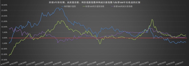 从动态的角度来看,这2个指数的风格会更加明显。下图是连续5年持有期上,2个风格指数跟大盘年化收益率的区别。