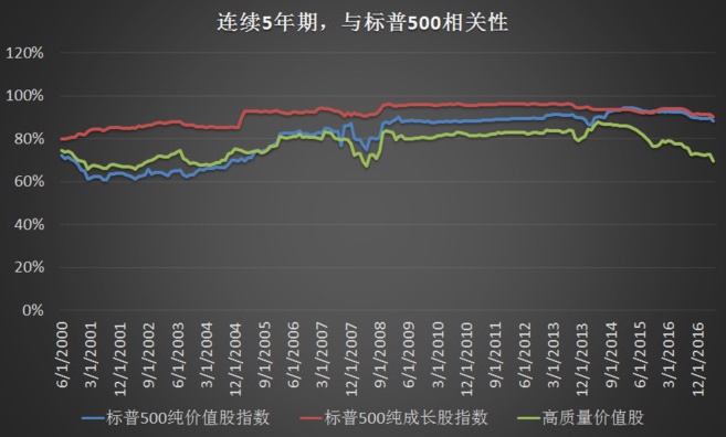 从动态相关性上来看,高质量高价值股与标普的相关性是最低的;而2014年开始,高质量高价值股与大盘的相关性持续走低。