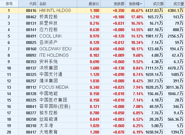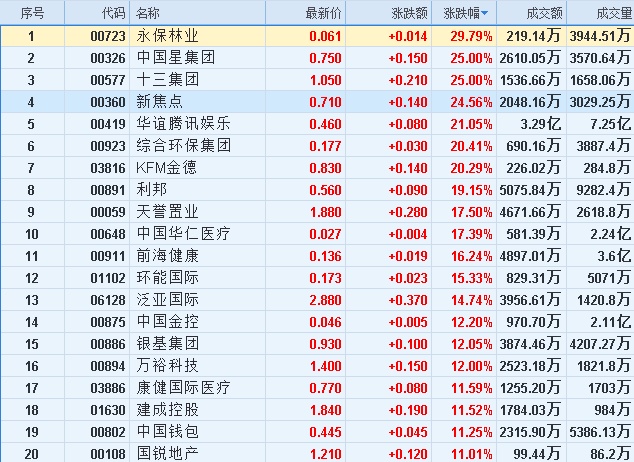 截至15时04分,HM INTL HLDGS(08416)涨幅居首,为49.33%。永保林业(00723)、中国星集团(00326)和KFM金德(03816)等7只个股涨超20%;前海健康(00911)、中国钱包(00802)和亚洲资产(08025)等19只股涨超10%。