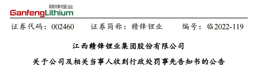 赣锋锂业表示,此事可能会对江西赣锋锂电科技股份有限公司(简称“赣锋锂电”)的分拆上市产生影响,最终结论以中国证监会江西监管局出具的行政处罚决定书为准。