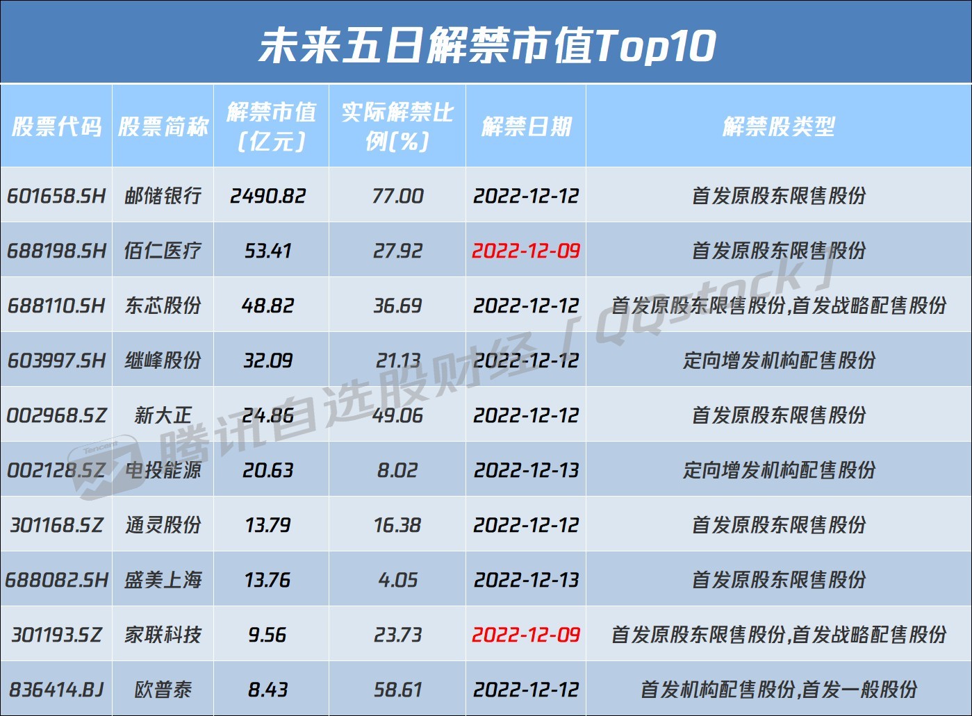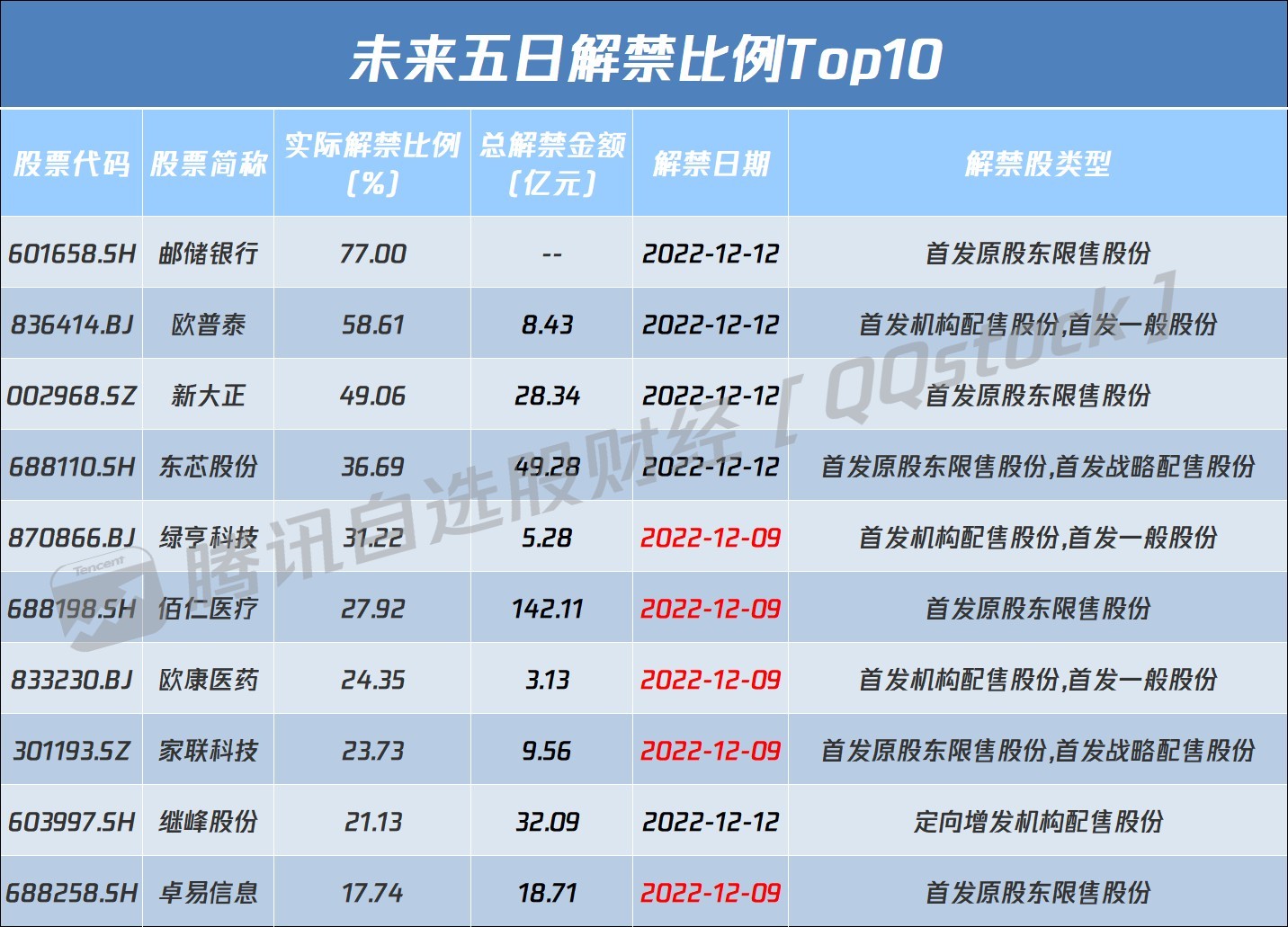 从解禁比例来看,未来5日邮储银行解禁比例达77%,其次解禁比例居前的分别为欧普泰、新大正;从解禁市值来看,邮储银行、佰仁医疗等股解禁市值居前。