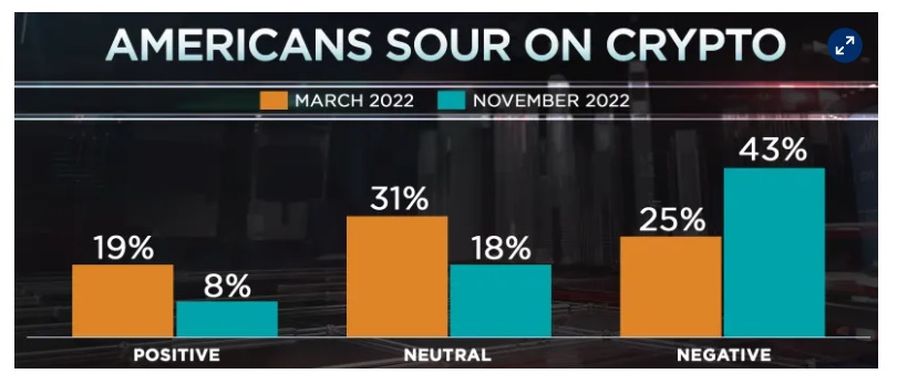 在一系列加密货币崩溃、丑闻和破产之后,美国人对加密货币的看法急剧恶化,CNBC全美经济调查发现,大多数人支持加强监管。调查显示,43%的公众对加密货币持负面看法,高于3月份的25%。持积极态度的受访者比例从19%骤降至8%,持中立态度的受访者比例从31%降至18%,降幅近一半。