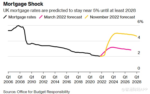 根据Moneyfacts Group Plc的数据,两年期固定利率抵押贷款的利率超过6%,这意味着现在转抵押贷款的人可能会看到他们的还款翻倍。英国预算责任办公室预计,平均抵押贷款成本可能在2028年前维持高位。