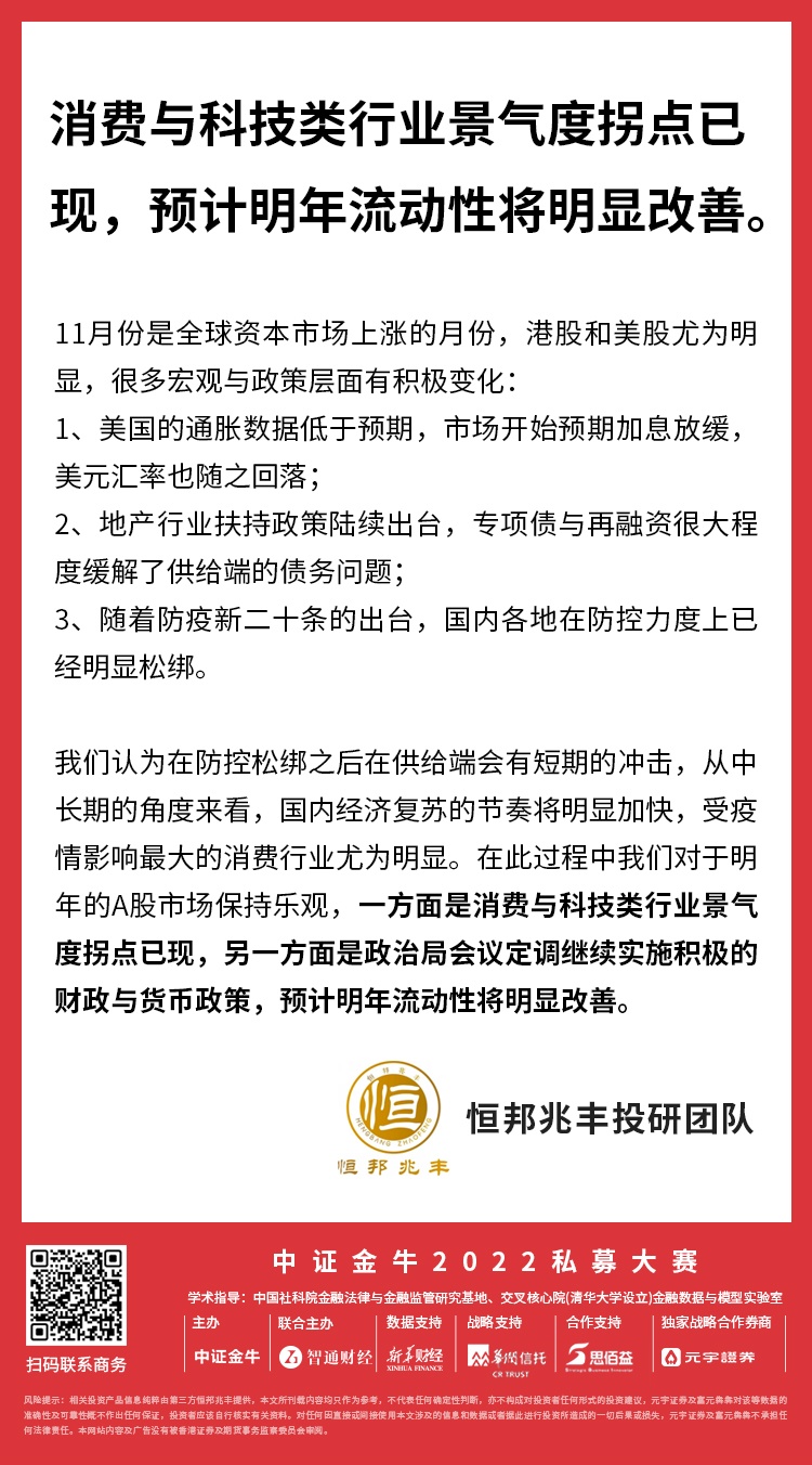 智通财经APP获悉,由元宇证券独家战略支持的中证金牛2022私募大赛于12月1日正式启动,赛事正如火如荼开展。近期不少参赛机构研究员和产品主理人就市场走势和行业展望发表真知灼见。深圳市恒邦兆丰私募证券基金管理有限公司投研团队表示,11月份是全球资本市场上涨的月份,港股和美股尤为明显。已经能够看见很多宏观与政策层面积极的变化: