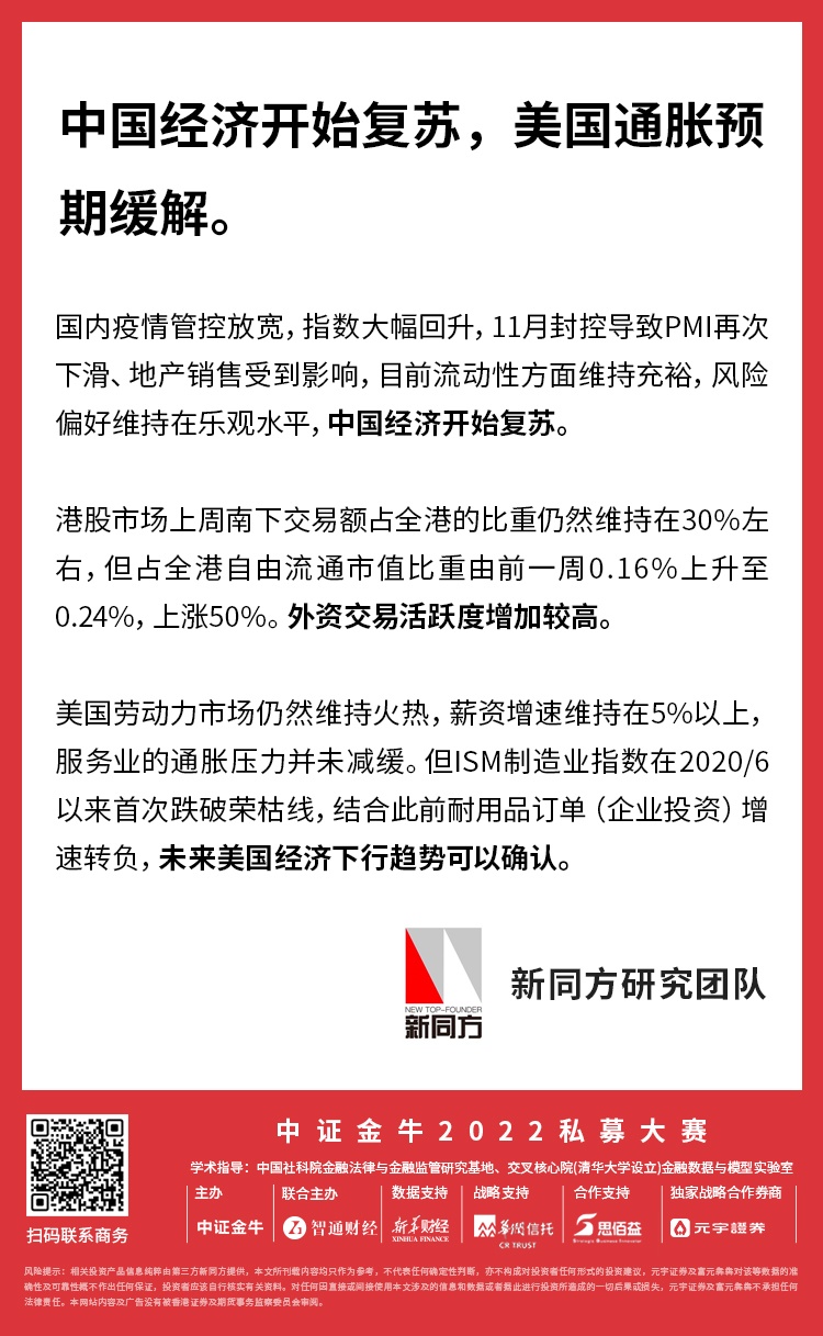 新同方资管表示,国内疫情管控放宽,指数大幅回升,11月封控导致PMI再次下滑、地产销售受到影响,目前流动性方面维持充裕,风险偏好维持在乐观水平,中国经济开始复苏。
