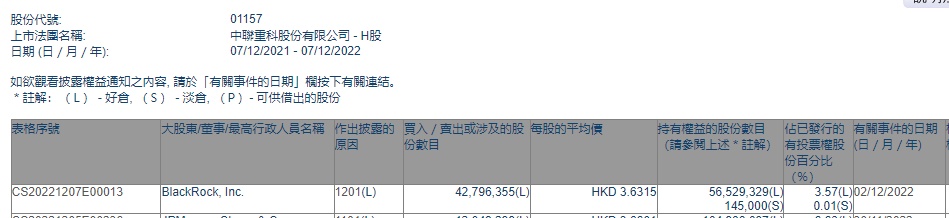 智通财经APP获悉,香港联交所最新资料显示,12月2日,贝莱德减持中联重科(01157)4279.6355万股,每股作价3.6315港元,总金额约为1.55亿港元。减持后最新持股数目约为5652.93万股,最新持股比例为3.57%。
