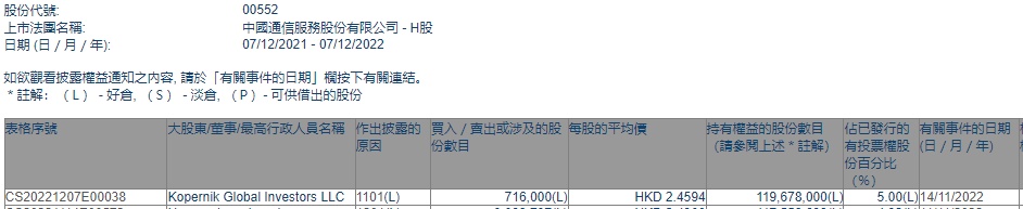 智通财经APP获悉,香港联交所最新资料显示,11月14日,Kopernik Global Investors LLC增持中国通信服务(00552)71.6万股,每股作价2.4594港元,总金额约为176.09万港元。增持后最新持股数目约为1.20亿股,最新持股比例为5%。