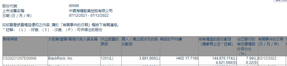 智通财经APP获悉,香港联交所最新资料显示,12月2日,贝莱德减持海螺创业(00586)389.1万股,每股作价17.7165港元,总金额约为6893.49万股港元。减持后最新持股数目约为1.45亿股,最新持股比例为7.99%。