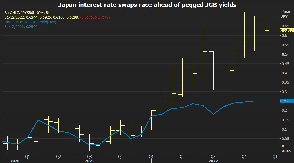 瑞银驻伦敦的策略师James Malcolm表示:“只关注10年期日债收益率和YCC已经没什么意义,因为与之相关的利率市场已经完全脱离了YCC政策。”他指出,直到今年年初,10年期掉期合约的收益率曾远不及日本国债收益率,如今已翻了一倍多,达到63个基点。