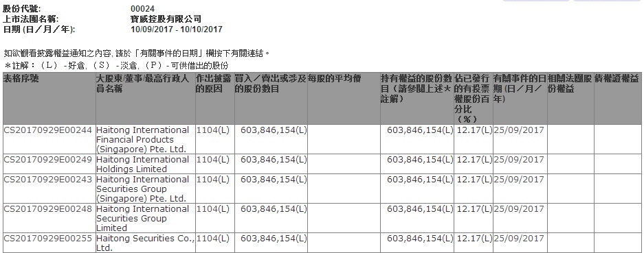 9月25日,宝威向海通新加坡发行了约6.04亿可换股债券,合计筹资约1.56亿港元。巧合的是,在公告发布当日,海通国际及旗下投资公司的增持记录就出现在了港交所的权益披露中,刚好增持了6.04亿股,持股率为12.17%,一跃成为宝威的第三大股东。