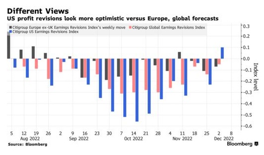 花旗的一项指数显示,尽管全球企业的盈利预期普遍被下调,但上周,美国企业盈利被上调的速度自5月以来首次超过了被下调的速度。Buckland对此表示,分析师都过于乐观了。他的团队预测,明年MSCI ACWI指数的每股收益将下降5%至10%,相比之下,市场平均预期为增长3%。