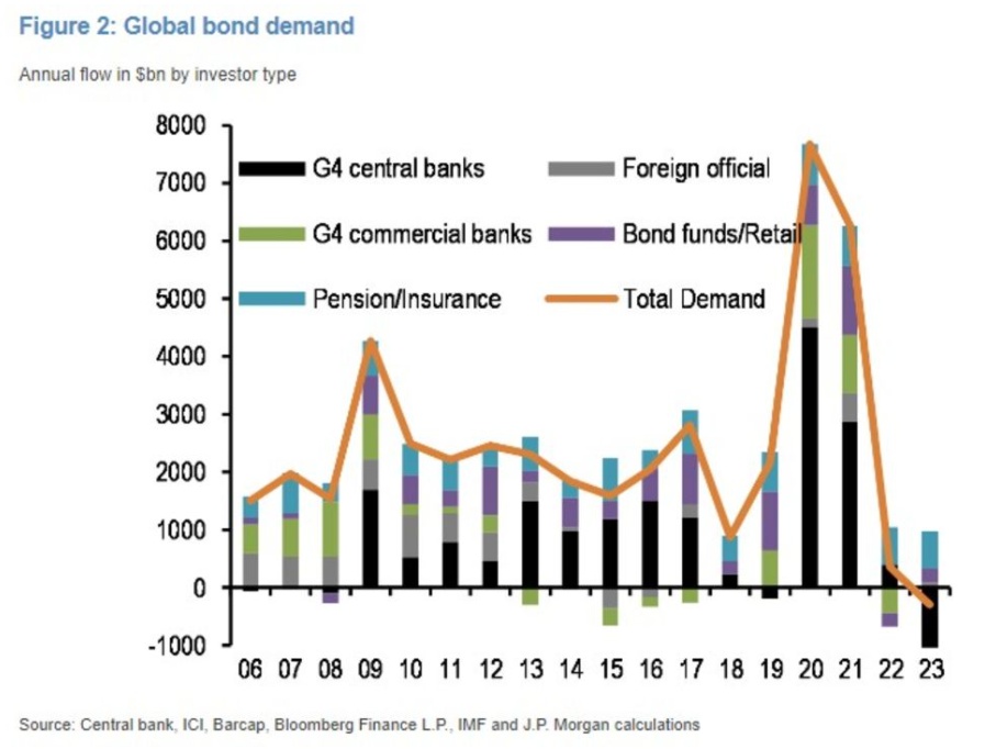 据该团队估计,来自机构投资者(养老金、共同基金和对冲基金)的净需求今年已经缩水2.1万亿美元。数据显示,债券市场的需求也大幅下降,至少达到2006年以来的最低水平,预计2023年将进一步疲软。