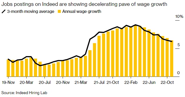 智通财经APP获悉,美国招聘平台Indeed的数据显示,到明年下半年,美国的工资增长有望回落至疫情前水平。Indeed基于其网站上刊登的职位的工资汇编了一个新的指数,该指数显示,11月的工资同比涨幅为6.5%,低于今年3月约9%的峰值,且这种工资增长放缓是广泛的,超过五分之四的工作职位的工资增长率低于6个月前。
