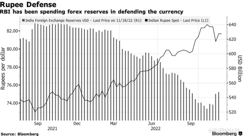 印度货币当局今年的外汇储备减少了830亿美元,原因是该机构抛售美元以支撑卢比,而其持有的其他外国资产也在贬值。这有助于将卢比兑美元的跌幅缓冲至10%左右,使其跌幅与亚洲新兴货币持平。