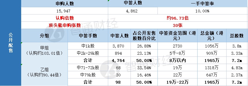 其中,公开配售申购人数15947人,一手中签率10.00%,认购倍数约96.73倍。