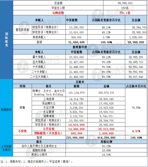 国际配售申购人数未披露,认购倍数约1.1倍。
