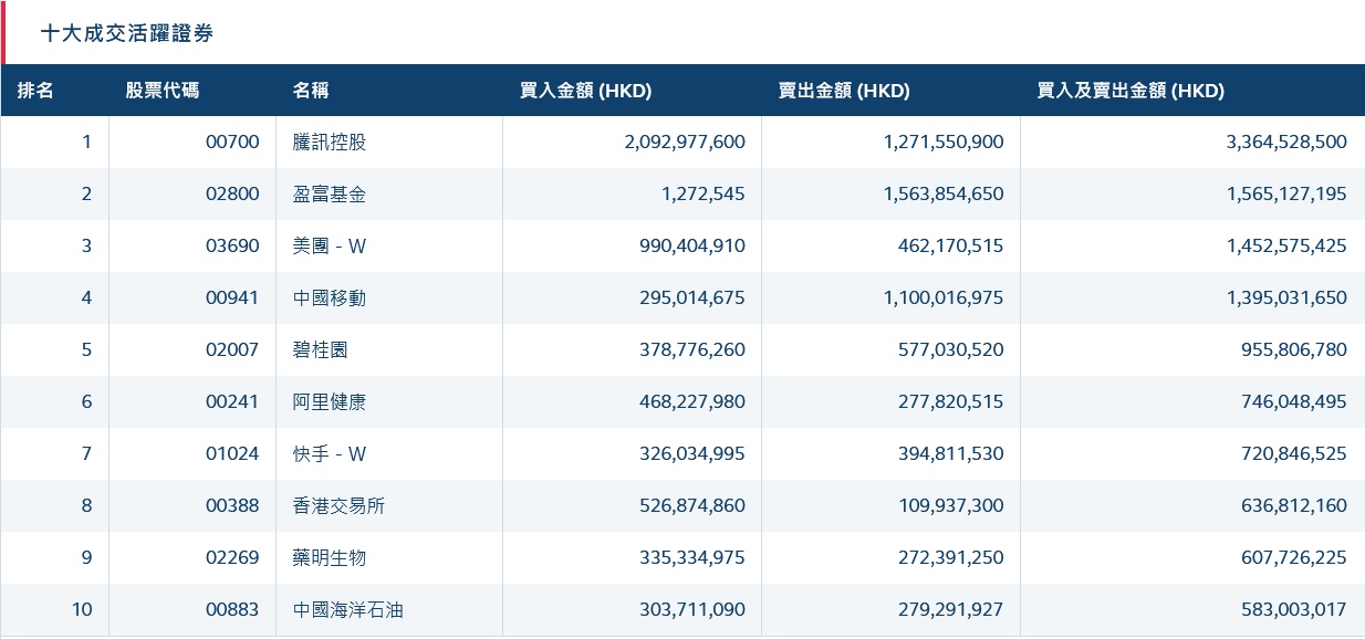 此外,药明生物(02269)获净买入2249万港元。而中国移动(00941)、盈富基金(02800)分别遭净卖出8.44亿、15.62亿港元。