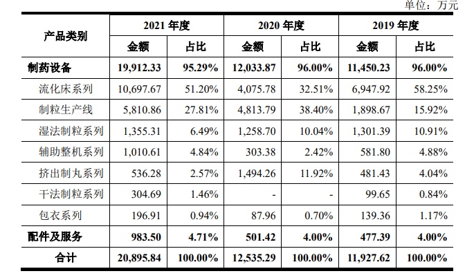 据招股书,创志科技是一家专注于制药装备领域的高新技术企业和江苏省“专精特新小巨人企业”,致力于为制药企业提供药物固体制剂领域的全套定制化智能解决方案。其主要从事药物固体制剂生产设备的研发、设计、生产和销售,并提供从工艺摸索、工艺优化到工艺升级的全套工艺支持服务,主要产品包括流化床系列、湿法制粒系列及制粒生产线等药物固体制剂生产设备,均属于药物固体制剂生产过程中的核心工艺型设备,不仅对保证药物生产质量、提高生产效率、降低生产成本及促进绿色环保具有重要影响,而且直接关系到部分复杂固体制剂品种的成功研发和顺利放大生产。