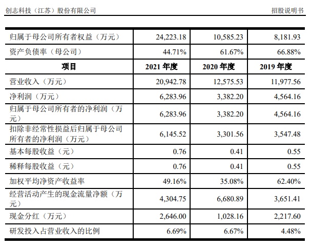 财务方面,2019年、2020年、2021年,创志科技分别实现营收1.20亿元、1.26亿元、2.09亿元,净利润分别为4564.16万元、3382.2万元、6283.96万元。