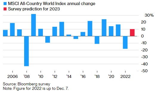 Hideyuki Ishiguro的高级策略师Hideyuki Ishiguro预计2023年市场走势将“与今年完全相反”。部分原因是估值下滑,导致MSCI全球基准股指(ACWI)的交易价格已接近其长期平均12个月的远期市盈率。