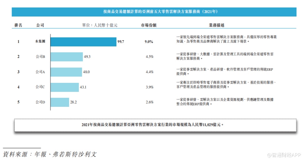 招股书显示,多点数智为本地零售业提供基于云的一站式端到端的数字零售SaaS平台。根据弗若斯特沙利文的资料,按商品交易总额计算,公司目前是中国及亚洲最大的零售云解决方案数字零售服务商及中国唯一的端到端全渠道零售云解决方案服务商。截至2021年12月31日,公司在中国和亚洲的市场份额分别为14.8%及9.0%。