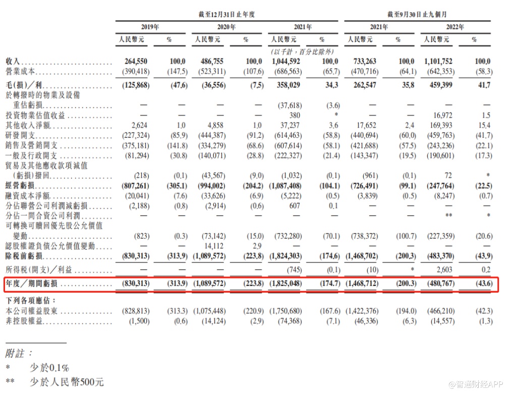 然而,由于营业成本、研发开支、销售及营销开支等成本费用占营收比重较高,多点数智尚未实现盈利。2019年度、2020年度、2021年度及2022年前九个月,公司毛利分别约为-1.26亿元、-3655.60万元、3.58亿元及4.59亿元;毛利率分別为-47.6%、-7.5%、34.3%、35.8%及41.7%;净亏损约为8.3亿元、10.9亿元、18.25亿元及4.81亿元,上述期间累计净亏损高达42.26亿元。