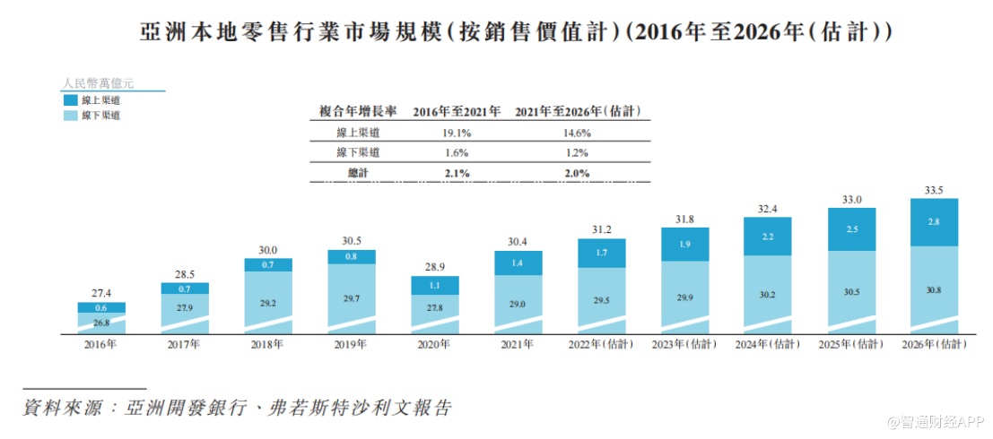 按商品交易总额计算的市场规模指本地零售行业中的本地零售云解决方案服务商促成的交易总量。按商品交易总额计算,中国零售云解决方案行业的市场规模自2016年的844亿元增加至2021年的6,443亿元,复合年增长率为50.2%,预计自2021年至2026年期间将以40.8%的复合年增长率增长,于2026年达到35,650亿元。就亚洲而言,按商品交易总额计算的零售云解决方案行业的市场规模自2016年的1,930亿元增加至2021年的11,029亿元,复合年增长率为41.7%,预计2021年至2026年期间将以35.8%的复合年增长率增长,于2026年达到50,932亿元。