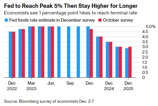 智通财经APP获悉,根据一份在12月2日至7日期间对44名经济学家的调查显示,美联储很可能会在整个2023年将利率维持在峰值水平,这将粉碎市场对明年下半年降息的预期,并极有可能导致美国经济陷入衰退。