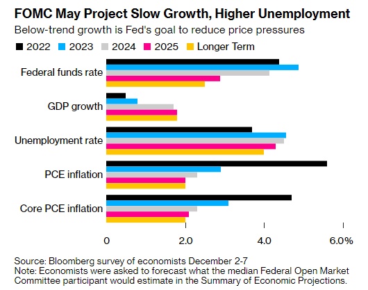 经济学家还认为,美联储对经济预测的总结可能表明,政策制定者预计美国经济增长将放缓,失业率略高于9月份的预期。美联储可能会将2023年的增长预期从9月份的1.2%下调至0.8%,同时失业率将上调至4.6%。上个月,美国失业率为3.7%。