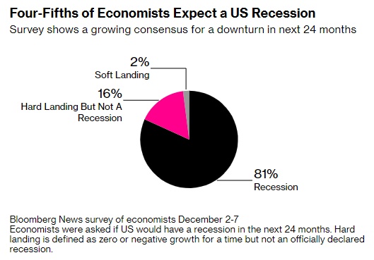 尽管美联储官员仍看到美国经济软着陆的一丝机会,但81%的经济学家认为美国将会陷入衰退。其余大多数经济学家认为美国经济将硬着陆,在持续一段时间内萎缩或零增长。76%的经济学家还认为可能会出现全球经济衰退。