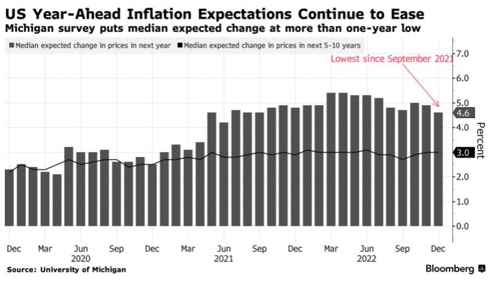 智通财经APP获悉,周五,密歇根大学公布的12月初值数据显示,消费者预计明年物价将以4.6%的年率攀升,低于一个月前的4.9%,为2021年9月以来的最低水平。长期通胀预期维持在3%。密歇根大学消费者信心指数从上个月的56.8上升至59.1,媒体对经济学家的调查中值预测为57。