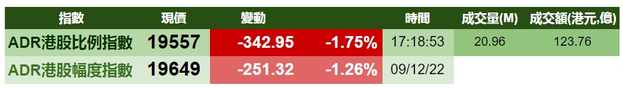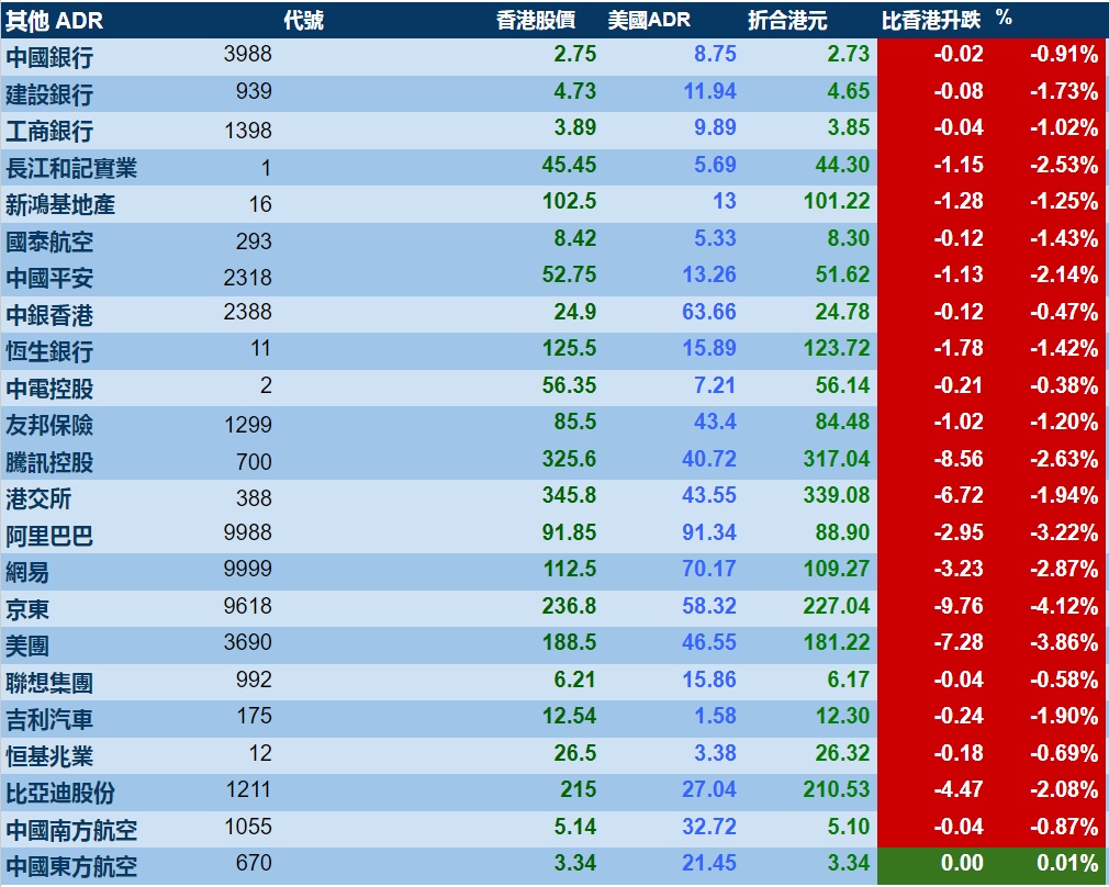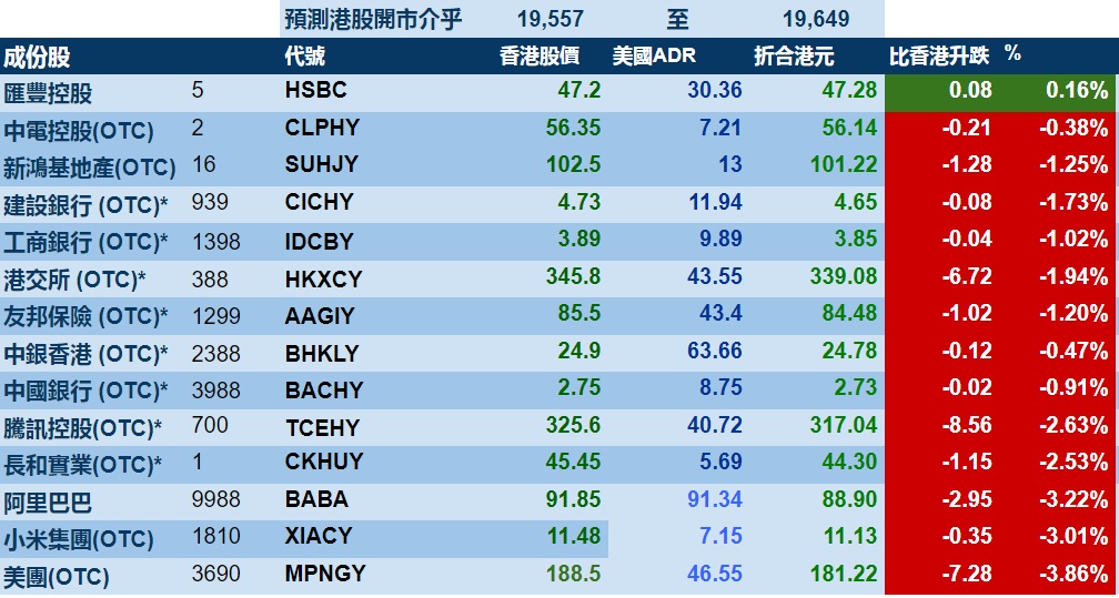 智通财经APP获悉,周五美股三大指数集体收跌,港股ADR指数下跌,按比例计算,收报19557点,较香港收市跌342.95点或1.75%。