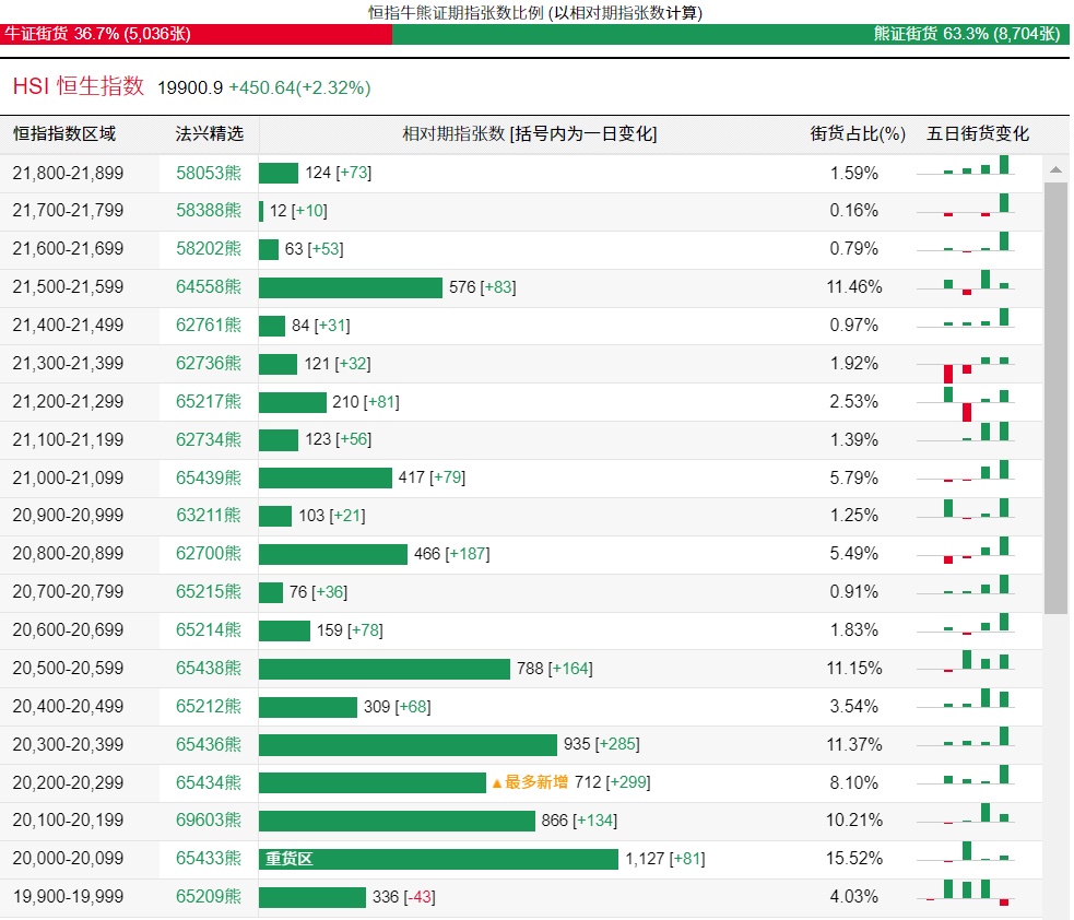 法兴恒指牛熊证街货分布图中的数据显示,熊证街货重货区在20000-20099区间,该区间最新熊证数量为1127张,较上一交易日增加81张;最多新增在20200-20299区间,该区间最新熊证数量为712张,较上一交易日增加299张。