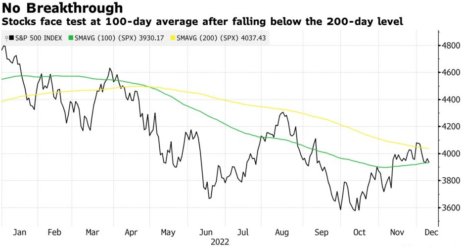 周期性股票导致标普500指数本周下跌3.4%,此前该指数未能维持在过去200天的平均价格之上。尽管自10月中旬以来,对美联储将放慢加息步伐的乐观情绪曾推动美国股市上涨14%,但投资者的情绪现在已经变得阴沉起来,他们担心美联储果真放慢加息步伐,将标志着美国经济陷入低迷。