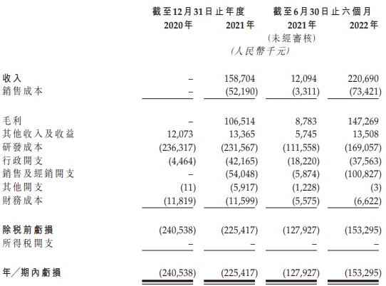 财务方面,2020年、2021年以及截至2021年及2022年6月30日止六个月,博安生物年/期内亏损约2.41亿元(人民币,下同)、2.25亿元、1.28亿元、1.53亿元。