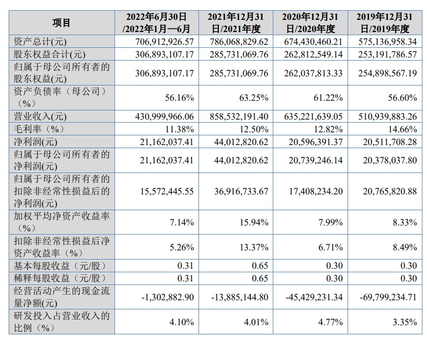 财务方面,2019年、2020年、2021年及2022年上半年,合肥高科实现营收5.11亿元、6.35亿元、8.59亿元、4.31亿元,净利润分别为2051.17万元、2059.64万元、4401.28万元、2116.20万元。