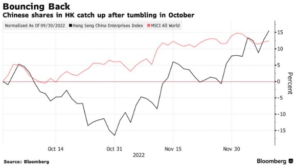 据悉,在经历了艰难的一年后,中国股市将以大幅反弹结束2022年。恒生中国企业指数在11月份开始上涨,自10月低点以来已上涨38%,主要由于此前疫情防控政策的逐渐放开以有关部门所新公布对房地产行业支持措施的政策。但该指标目前仍较2021年2月的峰值有着44%的增长空间。