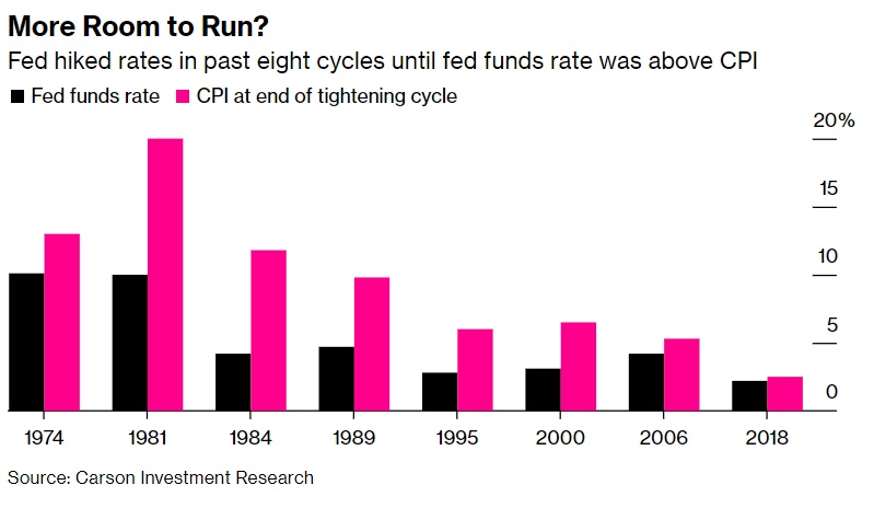 还有更大的加息空间? 美联储在过去8个周期中持续加息,直到联邦基金利率能够压制CPI