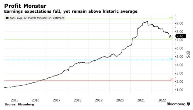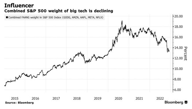 尽管不少科技股今年已录得较大跌幅,但该行业的痛苦似乎仍将在明年继续。根据汇编数据显示,分析师预计明年该行业利润将萎缩1.8%,相比之下,美国整体市场的预期增长率为2.7%。其中,FAANG在标普500指数中所占权重仍超过10%,因此未来几年表现欠佳可能将对整体市场构成重大拖累。
