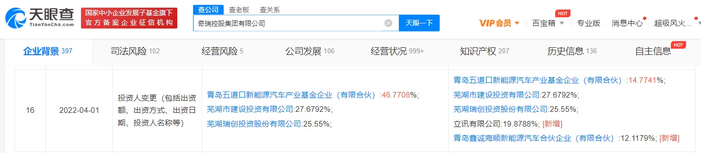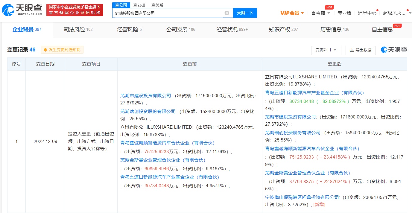 值得一提的是,今年4月,立讯有限公司也入股了奇瑞控股集团有限公司,持股约19.88%。