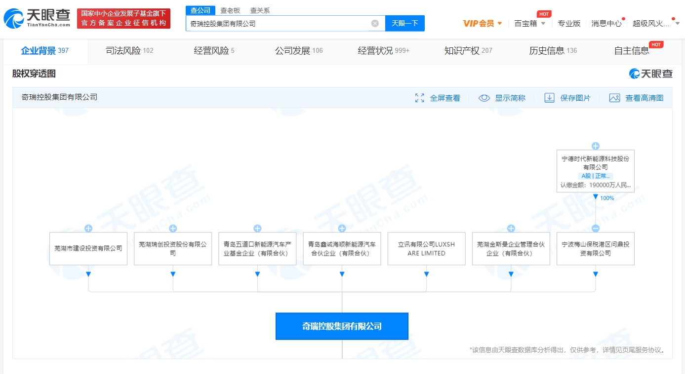 智通财经APP获悉,天眼查App显示,近日,奇瑞控股集团有限公司发生工商变更,股东新增宁波梅山保税港区问鼎投资有限公司,持股约3.73%,后者为宁德时代(300750.SZ)全资子公司。